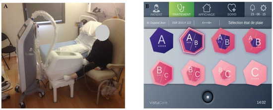 Vistacare® (DTAMedical SAS, Loulle, France) is a device developed to control the wound environment in each phase of the healing process (Figure 1). It is divided in two parts: a generator and a closed chamber, where the leg presenting with the diabetic foot ulcer is placed. Moisture (from 40 to 85%), temperature (from 32 to 34 °C), and oxygen levels (from 21 to 50%) are controlled and modulated in three predetermined sets classified as A (for debridement), B (for granulation), and C (for epithelialization). Temperature is controlled between 32 and 34 °C for all sets. For set A, the average moisture is 80 ± 10% with variations between the two extremes, and the average oxygen level is 40 ± 10% with progressive variation. For set B, the average moisture is 60 ± 20% with variations between the two extremes, and the oxygen level varies between 20% and 50%, with brutal and cyclic variations in stress cells. For set C, the average moisture is 50 ± 10% with variations between the two extremes, and the average oxygen level is 30 ± 10% with progressive variation. No dressing is needed during the entire treatment, with the wound being in a controlled environment. A window at the top of the chamber allows for direct visual access to the wound. Depending on the evolution of the wound, it is possible to change from one predetermined set to another at any time during the treatment. Each (+) sign displayed on the screen within the set pictogram corresponds to 3 h of treatment within the 12 h cycle, which is repeated until human intervention occurs (Figure 1B). Mechanical debridement can also be performed when needed, and offloading of the wound is maintained during the entire treatment. When using Vistacare®, patients should be hospitalized for 10 to 14 days, and the wound environment control treatment should be applied for at least 16 h per day.