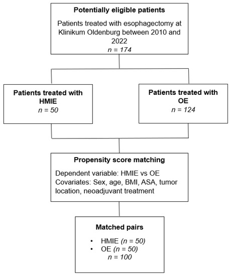 In our surgical department 174 patients received an Ivor Lewis esophagectomy for treatment of esophageal cancer from January 2010 until August 2022. HMIE was introduced as a new operating technique for underlying malignancy of the esophagus in 2019. Due to the new implementation, a hybrid approach was favored over MIC. In addition, HMIE is preferred over MIC at our institution, as it seems to be associated with a lower rate of anastomotic leakage [4,9]. This study retrospectively analyzed perioperative morbidity and mortality and the differences between two surgical techniques. HMIE was performed on 50 patients. We paired these with 50 patients treated with OE. All patients with an esophagectomy and reconstruction with gastric pull-up operated on in our surgical department in the aforementioned time span were considered for matching. This study was conducted in accordance with the ethics committee of the University of Oldenburg (AZ 2022-116). A flow chart of the study design is shown in Figure 1.
