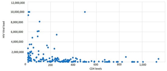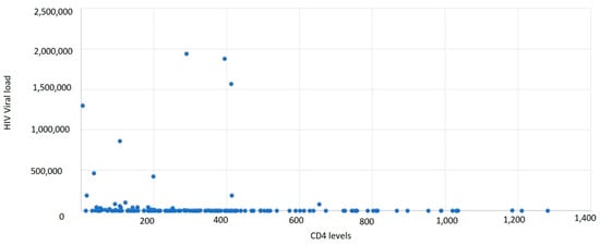 In a study from South Asia, it was found that the mean age of HIV/AIDS patients was 36.38 ± 10.62 years. The data presented are consistent with those from our study (mean age of our study group—35.35). The most common symptoms were fever (28.89%), weight loss (28.61%), and generalized weakness (22.22%). The overall mean CD4 count was 176.04 ± 163.49 cells/mm