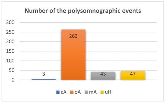 A polysomnographic study showed severe obstructive sleep apnea syndrome (AHI = 67.8) with the most prolonged apnea episode duration of 1 min and 55 s (Table 1). Most episodes were represented by obstructive apneas (oA = 73%), while central and mixed apneas represented 1% and 12%, respectively. The rest of the 13% were hypopneas (Chart 1).