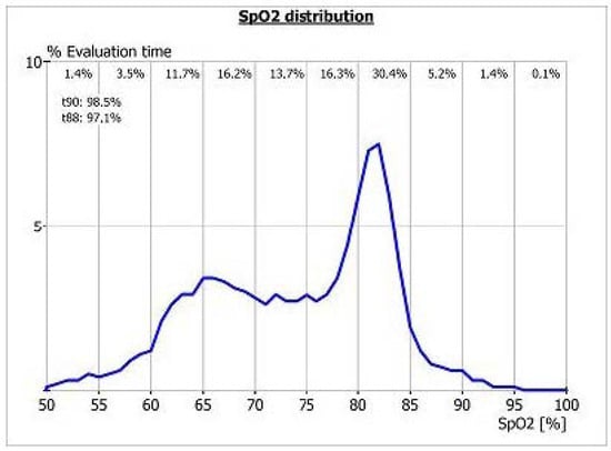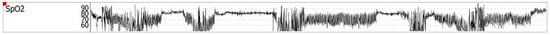 These frequent and prolonged apnea episodes influenced pulsoxymetric parameters (Chart 2), determining a desaturation index of 90.0, with a mean O2 saturation of 74% and a minimum saturation of 50% during sleep (Table 2), (Chart 3). The SpO2 reading on the pulse oximeter was 86% during the day, with a pulse range of 65 to 111.