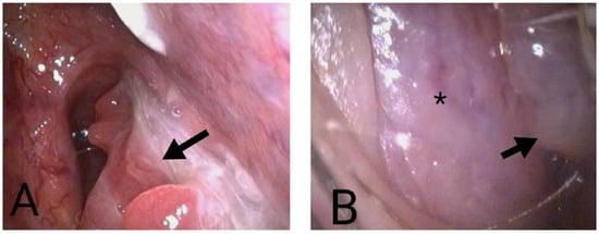 Endoscopic view of the nasal tumor (A) right choanal extension of the tumor (black arrow) (B) tumor occupying the entire left nasal fossa (black arrow), anterior nasal deviation (*).