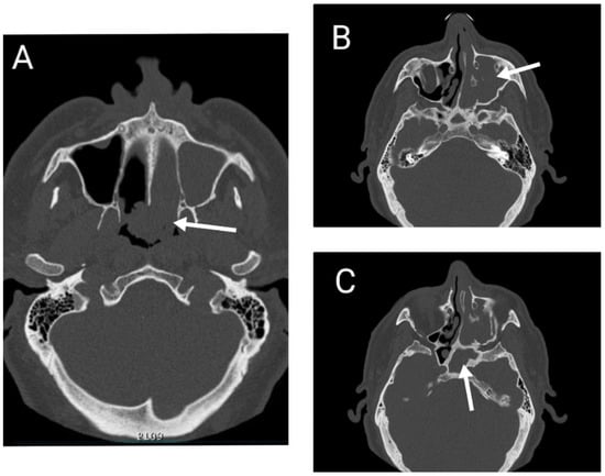 CT scan of the head and paranasal sinuses showing tumor extension in the (A) nasal cavity, nasopharynx, and contralateral choana, (B) maxillary sinus, (C) sphenoidal sinus.