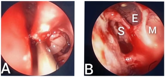 Intraoperative view: (A) part of tumor occupying left maxilar sinus (B) sphenoidal (S), posterior ethmoidal (E) and maxillary (M) sinuses free of tumor.