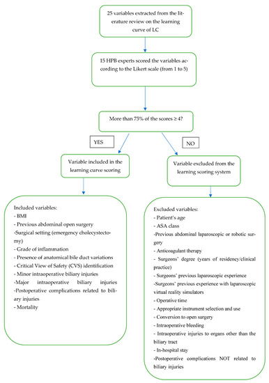 As the risk of intraoperative and postoperative complications is mainly related to the characteristics of the patient and to the degree of gallbladder inflammation, the Tokyo guidelines (TG18) provided recommendations on the surgical and clinical approaches to be adopted in emergency settings according to the grade of cholecystitis [11]. Consequently, the risk of complications is lower in elective settings and becomes greater as inflammation increases [8]. To perform a safe cholecystectomy, a thorough knowledge of normal biliary anatomy and its related variations, the identification of predictive factors for difficult surgery, as well as the use of correct techniques are considered fundamental [3]. Different articles have attempted to assess the learning curve for this procedure [12,13,14]. However, the available literature has yet to clearly determine the variables to be considered in measuring the learning curve, with large differences among studies [13,15] that do not make it possible to draw any solid conclusions [16]. The characteristics of the gallbladder and the patient, as well as the degree of inflammation, are taken into account by only few articles currently [16]. Consequently, the learning curve is often calculated from procedures where patient characteristics and the degree of complexity vary greatly. A recent systematic review [16] confirmed this heterogeneity. Indeed, the parameters to calculate the learning curve are not standardized and different authors considered different variables to evaluate the proficiency of surgical skills. The difficulty of the clinical setting and the risk of complications related to it are often not considered. The definition of the learning curve itself may be not very objective and is prevalently based on arbitrarily selected parameters. Surgical education is an active field of research, with increasing relevance especially in the field of minimally invasive surgery [4]. It seems crucial to define more objective and reproducible criteria to evaluate the surgical learning curve of such a widely performed intervention as laparoscopic cholecystectomy [16]. The aim of this study is to determine and define the variables that should be considered in the learning curve of LC and create a scoring system for learning curve assessment based on experts’ opinions during a dedicated surgical course. To our knowledge, this is the first study that has proposed implementing an educational scoring system using this methodological approach.