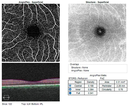 Currently, the Zeiss AngioPlex OCTA allows access to 3 × 3, 6 × 6, and 8 × 8 mm scans. In this study, considering that it was very important to get accurate measurements of the FAZ, 3 × 3 mm scans were used exclusively. The circularity index was also calculated, which describes how similar a geometric object is to a perfect circle. A perfect circle has a circularity index of 1, while a thin thread-like object would have this index approaching 0. Equation (1) for determining circularity is as follows:
