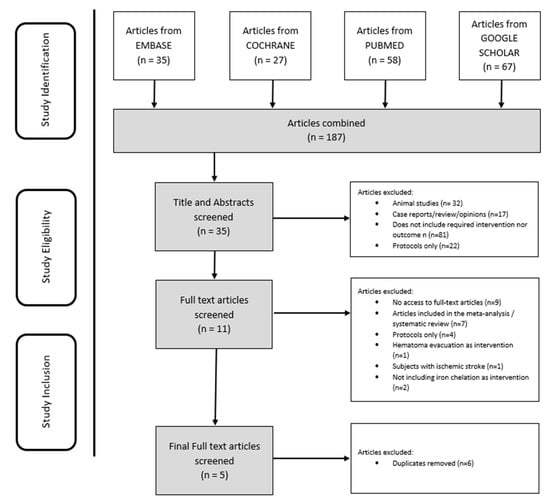 Literature searching was performed on 5 October 2022, on four journal databases (Pubmed, Embase, Cochrane, and Google Scholar) using related terminologies (Supplement Table S1). Our inclusion criteria were (1) meta-analysis and/or systematic review of randomized controlled trials (RCTs) and/or RCT with no restrictions of language and publication time; (2) iron chelating agent of all dosage as clinical intervention, defined as any drug aimed to prevent accumulation of excess body iron including deferoxamine (desferrioxamine), deferiprone, or deferasirox; (3) adult patients (>18 years old) presenting with intracranial hemorrhage, especially intracerebral hemorrhage, but not limited to, subarachnoid hemorrhage, subdural hemorrhage, and intraventricular hemorrhage; and (4) clinical improvement within 3 months after onset measured with National Institutes of Health Stroke Scale (NIHSS) and/or modified Rankin Scale (mRS) scores.