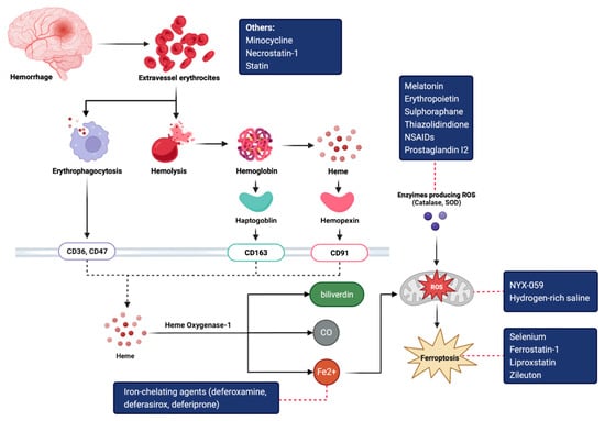 Currently, ICH studies focus on the potential benefits of protection from secondary brain injury from reactive oxidative species (ROS), inflammation, and toxicity of erythrocyte lysates. Secondary brain injury in ICH occurs because of the limited capacity of erythrophagocytosis in scavenging blood products, especially when the hematoma volume is progressively increasing. This leads to the accumulation of ferrous iron as the final product of heme breakdown, and later to iron toxicity. A labile iron pool would trigger ferroptosis, a process marked by cell death facilitated with glutathione depletion due to unregulated ferrous iron reacting with superoxide, generating ROS [,].
