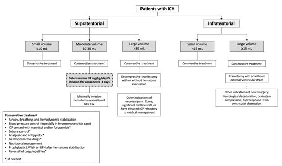 Hypothetical algorithm of ICH treatment with attribution of deferoxamine (dashed box) considering hematoma location and volume. GCS, Glasgow coma scale; ICP, intracranial pressure; LMWH, low-molecular-weight heparin; UFH, unfractionated heparin.