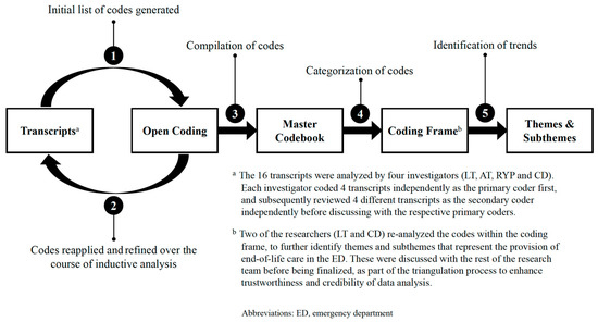 Data Collection and Analysis. The data collection included focus group discussions (FGDs) with healthcare professionals and one-on-one interviews with the next-of-kin. The reason for holding one-on-one interviews was to respect the next-of-kin’s psychological safety. Each session was facilitated by a pair of trained moderators and conducted in a private room at one of the three participating hospitals. Four of the investigators (L.T., A.T., R.Y.P. and C.D.) were involved as moderators. L.T. and R.Y.P. are emergency medicine physicians involved in palliative care initiatives, including research at their respective EDs in the participating hospitals. They did not facilitate sessions where participants were recruited from their EDs to minimize biases during the interviews. A.T. is a non-specialist physician who had worked in the ED of one of the participating hospitals in the past but was no longer a staff there at the time of the study. C.D. is a medical education researcher who is well-experienced in qualitative research and serves as the assistant director of the education office at a non-participating hospital. Both A.T. and C.D. did not have any working relationship with the participants.