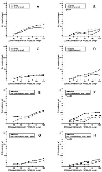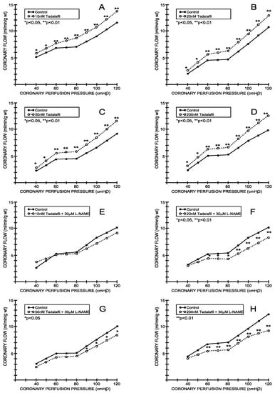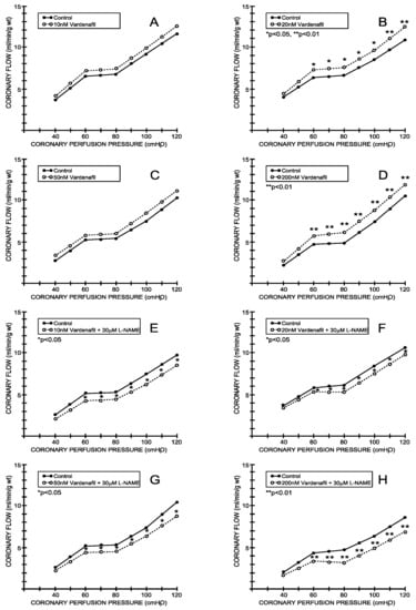 The coronary flow (CF) increased proportionally to the coronary perfusion pressure in the entire range of perfusion pressures studied in both the control and study groups. During the control conditions, the CF varied in a range between 3.14 ± 0.60 mL/min/g wt at 40 cm H2O and 10.40 ± 0.92 mL/min/g wt at 120 cm H2O (average values for all eight experimental protocols—Figure 1 and Figure 2). Tadalafil induced a significant increase in the CF in all applied doses (Figure 1A–D), while vardenafil induced similar changes when applied in concentrations of 20 and 200 nM (Figure 2B,D). The simultaneous application of L-NAME significantly reduced the influence of both inhibitors on the CF (Figure 1E–H and Figure 2E–H).