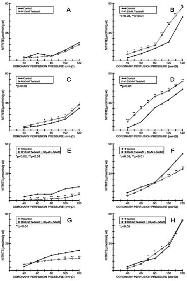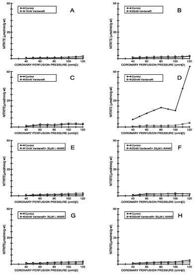 Tadalafil-induced changes in the coronary flow were accompanied by a significant increase in the nitrite outflow in all applied doses, except in the smallest one. On the other hand, vardenafil did not induce significant changes in the nitrites unless administrated at the highest dose. The simultaneous application of L-NAME reversed the effects of tadalafil, while there were no significant changes in the case of vardenafil. This supports the hypothesis regarding the contribution of the L-arginin/NO system on the effects of tadalafil and suggests that there may be another endothelial pathway for vardenafil-induced vascular effects [,,,,,,,,]. It seems that tadalafil expresses its effects similarly to sildenafil, through the augmentation of NO synthase and cGMP levels, which points to the possibility that the cardiovascular dysfunctions that include decreased NOS activity may be alleviated by tadalafil treatment [,].