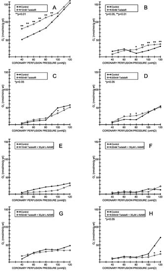 Effects of tadalafil and combination tadalafil + L-NAME on coronary flow. (A) Tadalafil, 10 nM, (B) 20 nM, C. 50 nM, (D) 200 nM, (E) Tadalafil + L-NAME, 10 nM + 30 μM, (F) Tadalafil + L-NAME, 20 nM + 30 μM, (G) Tadalafil + L-NAME, 50 nM + 30 μM, (H) Tadalafil + L-NAME, 200 nM + 30 μM.