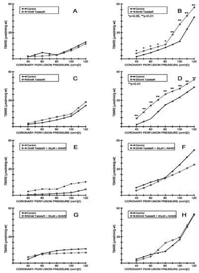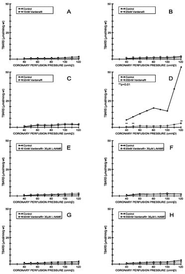 Under the control conditions, the TBARS outflow varied between 3.25 ± 1.53 μL/min/g wt at 40 cm H2O and 5.23 ± 2.16 mL/min/g wt at 120 cm H2O and was parallel with the CPP-CF curve (average values for all eight experimental protocols—Figure 7 and Figure 8). Tadalafil-induced changes in the CF were accompanied by a significant increase in the TBARS production at doses of 20 and 200 nM (Figure 7B,D), while the other two doses did not induce significant changes in the TBARS production (Figure 7A,C). Furthermore, vardenafil did not induce significant changes in the TBARS production at any of the applied doses (Figure 8A–D). The simultaneous application of L-NAME did not induce any significant changes in the TBARS production in either the tadalafil- or vardenafil-treated hearts (Figure 7E–H and Figure 8E–H) compared to the controls.
