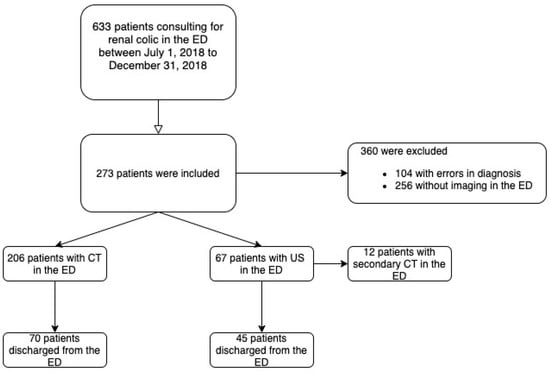 A total of 273 consecutive patients aged over 18 years consulting for renal colic with US or CT performed in the ED for the diagnostic workup were included from 1 July 2018 to 31 December 2018 (Figure 1).