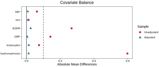 Standardized mean difference (SMD) in the unadjusted and adjusted with propensity score populations. CRP: C Reactive Protein. eGFR: Cockcroft estimated glomerular filtration rate.