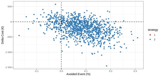 The variability of the results was assessed using non-parametric bootstrapping, which provided multiple estimates of the ICER by randomly re-sampling the patient population 1000 times. For each iteration, we computed propensity scores and new regression models. The results are presented as a scatter plot of 1 000 ICERs on the cost-effectiveness plane.