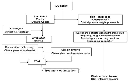 - Abdul-Aziz, M.H.; Alffenaar, J.C.; Bassetti, M.; Bracht, H.; Dimopoulos, G.; Marriott, D.; Neely, M.N.; Paiva, J.A.; Pea, F.; Sjovall, F.; et al. Antimicrobial therapeutic drug monitoring in critically ill adult patients: A Position Paper. Intensive Care Med. 2020, 46, 1127–1153. [Google Scholar] [CrossRef] [PubMed]