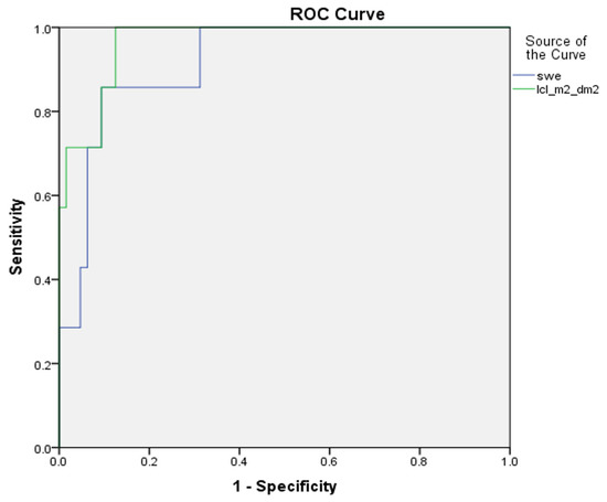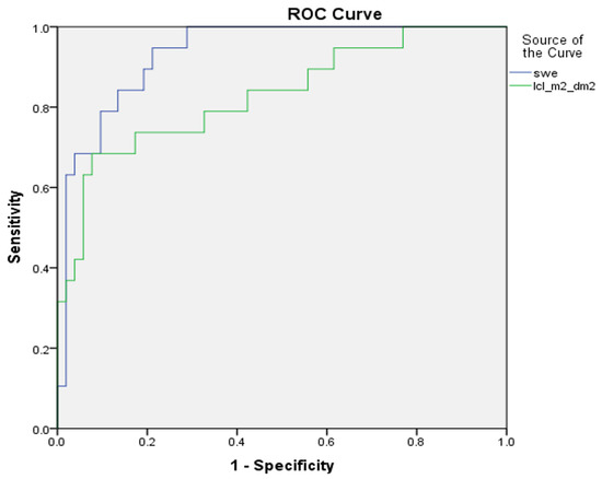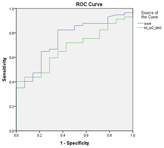 We looked for associations between the fibrosis score from the core needle biopsy sample, using 2D-SWE and LCL scintigraphy parameters. Student’s t-test was used to find differences between two groups of variables with normal distribution, and the Mann–Whitney U test, for non-parametric continuous variables. For differences between three or more groups, a one-way analysis of variance (ANOVA) and the Kruskal–Wallis H test were used. Pearson’s correlation test and Spearman’s rank-order correlation coefficient were used to find correlations between continuous variables. A binomial logistic regression model was used to investigate whether a combination of independent variables predicted a probability of fibrosis stage. An R program, Compbdt, was used to compare sensitivity and specificity between tests for liver fibrosis (2D-SWE, LCL, or a regression model). A MedCalc function, Comparison of ROC curves, with the method of DeLong et al., was used to compare areas under the curve of these tests, and the Youden Index was used to set the threshold values [41,42]. The significance level was set at 0.05.