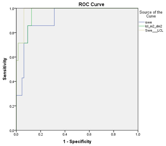 Third, both imaging methods work by somewhat different mechanisms—2D-SWE represents mechanical changes in the liver tissue by evaluating the speed of transverse soundwaves propagating in altered hepatic parenchyma [29,30]. A different approach is employed in dynamic liver scintigraphy with 99mTc- mebrofenin. The passage of the iminodiacetic acid derivate mebrofenin through OATP receptors situated on the hepatocyte basolateral membrane resembles liver cell function, which is altered as liver fibrosis progresses [53,54]. By referring a different approach to these quantitative liver imaging modalities, we also combined them together to check if there is additional value. Although no additional value was seen in mild and significant fibrosis, at the late stages of CLD (liver cirrhosis), the area under the ROC curve increased from 0.91 to 0.98 (see Figure 6), which signifies an increased accuracy when two imaging modalities are combined.
