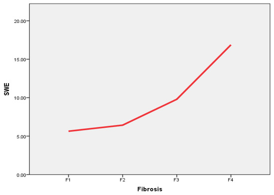 The 2D-SWE correlation with increasing liver fibrosis stage. Direct positive association is seen between liver fibrosis stage according to METAVIR and liver stiffness (2D-SWE), measured in kPa. SWE—2D-SWE value represented in kPa; Fibrosis—liver fibrosis evaluated in liver biopsy specimens according to METAVIR.