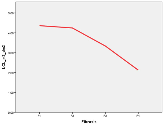 Liver clearance (LCL) relation to increasing liver fibrosis stage. Direct negative association between liver clearance (measured in %/min/m2/dm2), and liver fibrosis stage measured according to METAVIR is present. LCL_m2_dm2—liver clearance measured in right liver lobe and corrected with BSA and LA; Fibrosis—liver fibrosis evaluated in liver biopsy specimen according to METAVIR.
