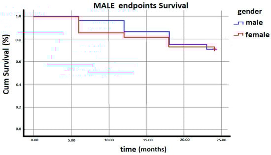 The mean follow-up of the two groups was 21 ± 2.4 months, with no significant differences between men and women. Two subjects in the male group were lost to follow-up by failing to complete any of the scheduled visits, while one subject in the female group was lost to follow-up after the first visit at 1-month post-index revascularization. There was a total of seven deaths during follow-up: three among women and four among men, none directly attributable to peripheral arterial disease (two strokes, three terminal neoplasms, and two of unknown cause). There were three major amputations in both groups, while surgical revascularization for recurrent limb-threatening ischemia occurred for five patients in the female group and only two in the male group. One patient who underwent dual-stent angioplasty for bilateral supra-inguinal involvement required emergency surgical revascularization for in-stent thrombosis 2 months post-PTA. The occurrence rate of MALE endpoints was similar in the two groups, at around 20%, as illustrated in Table 2. The Log Rank test applied to evaluate the distribution of survival according to sex did not return a statistically significant value (p = 0.914)—Table 3.