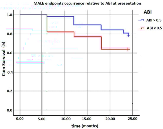 To our knowledge, this is the first study that correlates an ABI value below 0.5 with the occurrence of MALE in a population with symptomatic PAD followed over an extended period of time after percutaneous revascularization. Historically, an ABI < 0.9 was significantly associated with higher coronary mortality, all-cause mortality, or myocardial infarction in both women and men. A pathological ankle–brachial index was an independent predictor of stroke in women only, while an ABI between 0.9 and 1 was statistically significantly associated with coronary death in both women and men []. Further studies are needed to establish a clear relationship between ABI value at presentation and MALE occurrence rate.