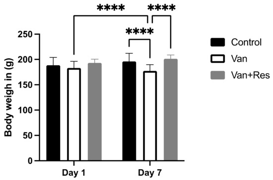 The effect of the resveratrol and vancomycin administration on the animals’ body weights during the experiment. **** p < 0.0001.