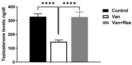 The effect of the resveratrol and vancomycin administration on the testosterone during the experiment. **** p < 0.0001.