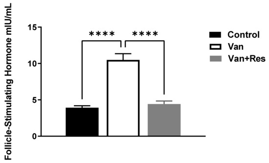 The effect of the resveratrol and vancomycin administration on the follicle-stimulating hormone during the experiment. **** p < 0.0001.