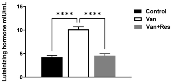 The LH level in the blood was determined on day 8 of the experiment. One-way ANOVA revealed significant changes in the level of LH (mIU/mL) between the treatment groups, as shown in the ANOVA table [F (2, 18) = 50.58, p < 0.0001, Figure 4]. Further analysis using Tukey’s multiple comparison tests showed a significant increase in the LH levels in the vancomycin group compared to the control group (p < 0.0001) and the vancomycin + resveratrol group (p < 0.0001). However, no significant changes were found between the control group and the vancomycin + resveratrol group (p = 0.8745).