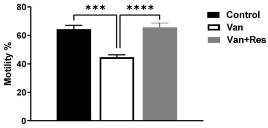 The effect of the resveratrol and vancomycin administration on the sperm during the experiment. **** p < 0.0001.