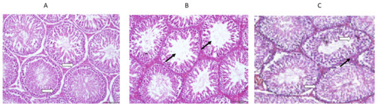 (A) The effect of the normal saline administration during the experiment on the histological sections of rat testes was a normal morphology with a normal thickness of the basal lamina (white arrows). (B) The effect of the vancomycin administration on the histological sections of rat testes was thinning and splitting of the basal lamina, with atrophy and widely separated seminiferous tubules (black arrows). (C) The effect of the resveratrol and vancomycin administration on the histological sections of rat testes was a normal thickness of the basal lamina (white arrows) and normal seminiferous tubules (black arrows).