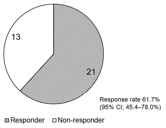 The frequency of bowel movements was examined for at least seven days before and seven days after the initiation of naldemedine treatment in all 34 included patients. The number of responders and non-responders is shown in Figure 1; 21 (61.7%, 95% CI: 45.4–78.0%) patients were responders, and 13 were non-responders. Table 3 shows the patient background information based on the response. The background characteristics of the responders and non-responders were not significantly different as per Fisher’s exact test.