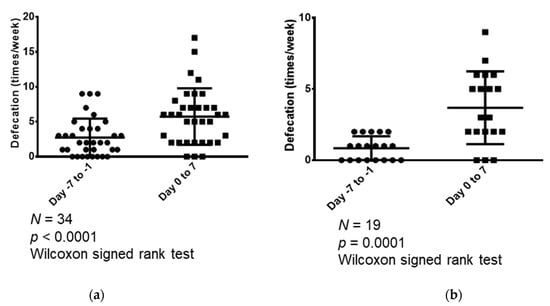 Comparison of the weekly number of bowel movements in the week (seven days) prior to and the week following naldemedine initiation. (a) Comparison of the number of bowel movements that occurred during the seven days before and seven days following naldemedine initiation in all patients (n = 34); (b) Comparison of the number of bowel movements that occurred during the seven days before and seven days following naldemedine initiation in patients who had less than three bowel movements in the seven days prior to naldemedine administration (n = 19).