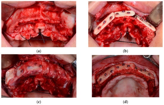 (a)—Initial situation after flap retraction; (b)—allogenic cortical lamina fixed in place; (c)—collagen membranes placed to protect the augmented site against epithelial invasion; (d)—augmented ridge after reopening (6 months after augmentation).
