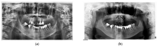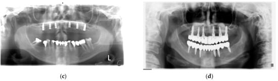 (a)—Initial orthopantomographic image taken before teeth extraction; (b)—orthopantomographic image after augmentation; (c)—orthopantomographic image after implant insertion; (d)—orthopantomographic image with implant fixture and definitive prosthetic work in place to check whether there is an adequate passive fit.