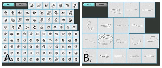 Automated urine microscopy revealed an abnormal value of white blood cells (WBC) of 330/μL (normal: <28/μL) (Figure 1A) and 19 bacteria/HPF (normal: <1/HPF) (Figure 1B).