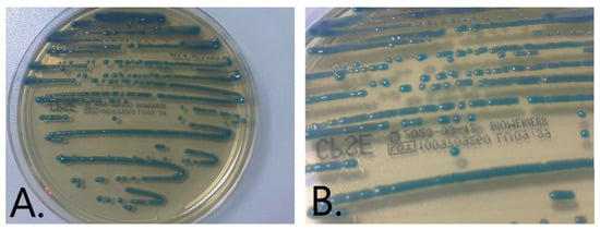 (A,B) Isolated green-to-blue colonies on chromID CPS Elite (bioMérieux) medium from the primary culture.