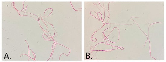 A Gram stain performed from the pure culture isolated on chromID media revealed long, filamentous Gram-negative bacilli and further proceeded to identify this bacterium (Figure 3A,B).