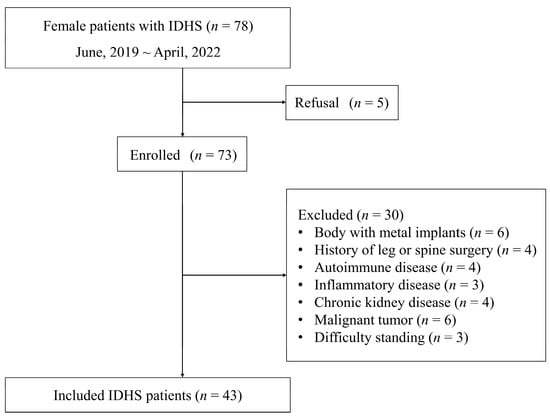 A flowchart of patient selection in each group is shown in Figure 1. From a total of 78 female patients with IDHS, we evaluated 73 for eligibility after excepting those who refused to participate. Excluding those with metal implanted in the body (n = 6), a history of lower extremity and spine surgery (n = 4), autoimmune disease (n = 4), inflammatory disease (n = 3), chronic kidney disease (n = 4), malignant tumor (n = 6), and difficulty standing (n = 3), a total of 43 patients were included in this study. No missing data were included in both the IDHS and healthy groups.