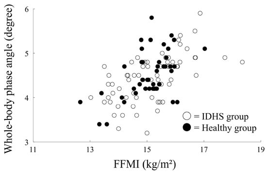 Results were presented as the means (standard deviation (SD)). SPSS version 25.0 (IBM, Armonk, NY, USA) was used for all statistical analyses. The Shapiro–Wilk test was used to assess the normality of each dataset. Propensity score (PS) matching was used for adjusting covariates in both groups []. Previous studies have reported covariate relationships between phase angle and age, height, and FFMI [,]. However, some researchers have stated that BMI is a determinant of phase angle [,]. In our study, the covariate was determined after evaluating the respective correlations between phase angle and FFMI and BMI in both groups. A logistic regression model was used to estimate the PS. One-to-one sampling without replacement was created using the nearest neighbor method. The caliper distance was set to 0.20 times the SD of PS logit. Considering that no previous studies have verified the phase angle of IDHS patients, in our study, the necessary sample size was verified by using post hoc power analysis. The power analysis used G*Power 3.1 (Heinrich Heine University, Düsseldorf, Germany). The Student’s t-test and Mann–Whitney U test were used for comparison of the groups. Pearson’s product-rate correlation coefficient and Spearman’s rank correlation coefficient were used for evaluating the correlations between whole-body phase angle and BMI and FFMI in both groups, and between McGS and the attribute and body composition variables in the IDHS group. A p-value < 0.05 was considered statistically significant.