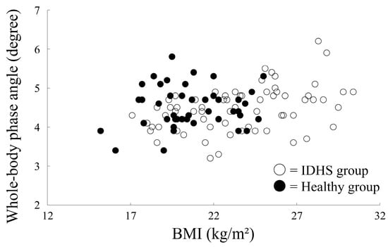 In recent years, the phase angle calculated by BIA has attracted attention as a marker associated with disease prognosis and physical status of elderly patients []. A higher phase angle value indicates healthier cellularity []. Previous studies reported that the phase angle is associated with skeletal muscle mass and muscle quality in healthy adult and elderly subjects [,]. Yamada et al. [] reported that the lower extremity phase angle was associated with aerobic capacity, complex gait ability, and total fitness age score in the elderly, better than that of the whole body and arms. Furthermore, walking speed in the elderly is associated with muscle mass and phase angle, in addition to muscle quality of the lower extremities []. Both the quantity and quality of the muscle should be evaluated for impairment of physical function in the elderly. However, to the best of our knowledge, there are no reports that include data regarding muscle quality in body composition analysis of patients with IDHS. Although studies using phase angle have the potential to forward current knowledge of the pathology of IDHS, there are no studies that have investigated this.