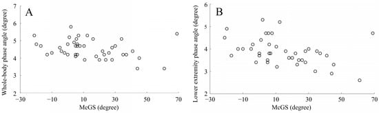 From the relationship of body composition data in the statistical correlation analysis, McGS was revealed to be significantly correlated with the whole-body phase angle (r = −0.31, p = 0.043) (Table 3, Figure 4A) and lower extremity phase angle (r = −0.39, p = 0.009) (Table 3, Figure 4B). There was no significant correlation detected between McGS and the other variables. As a result of post hoc power analysis (two tales, effect size ρ = 0.39, type I error probability = 0.05, sample size = 43), the power was 77% (i.e., type II error probability = 0.23), and sufficient detection power was obtained for the correlation between McGS and lower extremity phase angle in the IDHS group.