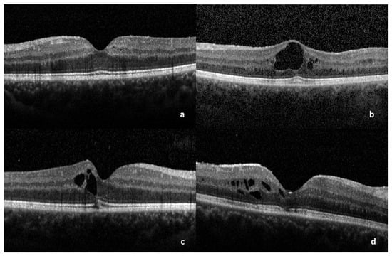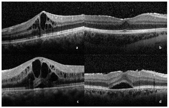 OCT scans showing: (a) Cystoid ME. (b) Diffuse ME. (c) SRD associated with cystoid ME. (d) SRD associated with diffuse ME. ME: macular edema, SRD: serous retinal detachment.