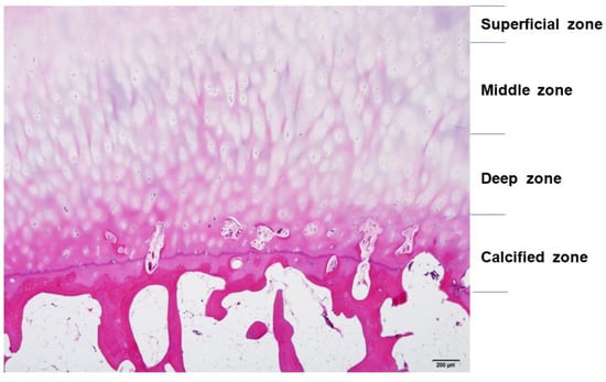 The structure of articular cartilage, comprised of four zones: superficial, middle, deep, and calcified. Among zones, there are differences in collagen fibers, arrangement of chondrocytes, and distribution of proteoglycans and glycosaminoglycans (GAGs). Hematoxylin and eosin staining. Scale bar, 200 μm.