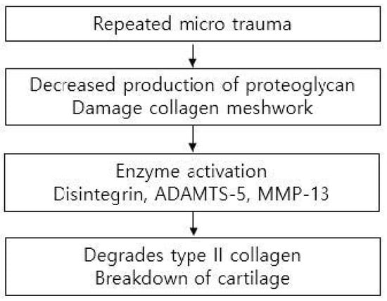 Cartilage can be damaged easily by acute trauma or repetitive microtrauma and is exposed to mechanical stress during active daily living. Such stress can be increased to 10 or 20 times the body weight during sports activities []. Acute cartilage injury initiates a repair process that starts with the formation of a blood clot containing bone marrow cells that form fibrocartilaginous tissue. However, repeated microtraumas damage chondrocytes, decrease production of proteoglycan, and damage collagen meshwork. As this meshwork limits water penetration, damage leads to swelling and stiffness of the tissue. Responses to cartilage injury involve both anabolic and catabolic reactions. Aggrecan-degrading enzyme disintegrin, metalloproteinase with thrombospondin motif 5 (ADAMTS-5), and collagenase matrix metalloproteinase 13 (MMP-13), which degrades type II collagen, all contribute to the breakdown of cartilage. However, the induction of chondroprotective genes leads to anabolic effects on the cartilage [] (Figure 4).