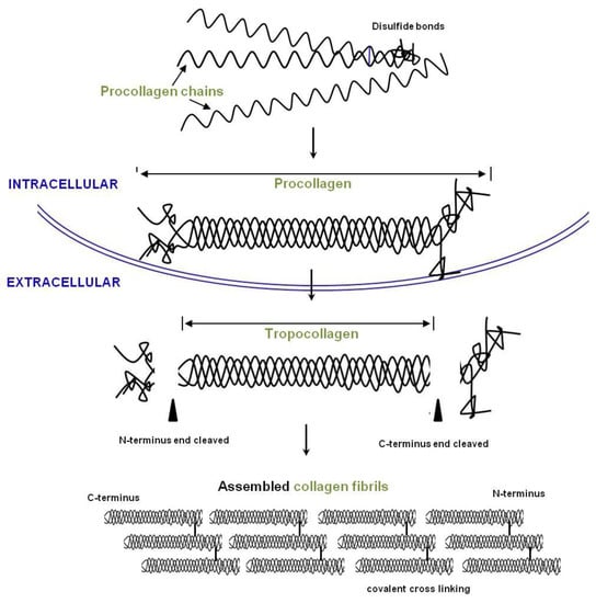 Overview of collagen production. Procollagen chains are synthesized and form a helix in the endoplasmic reticulum (ER). Propeptides are removed by proteinases, and the fibrils are assembled into collagen fibers in the extracellular space (EC).