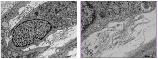 Transmission electron microscopy of differentiated mesenchymal stem cells (MSCs) into chondrocytes and extracellular collagen fibrils (box). (Left) Scale bar, 2000 nm; (Right) scale bar, 1000 nm.